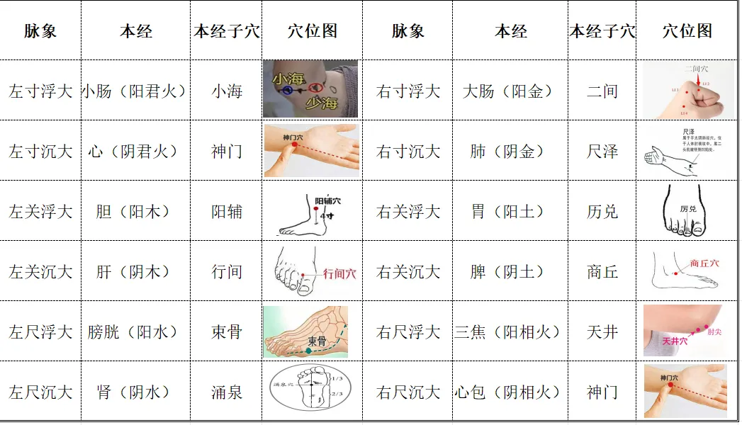 4、右寸浮大---大肠(阳金)---二间;右寸沉大---肺(阴金)---尺泽;