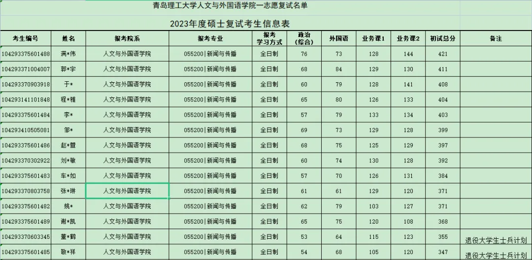 23年新闻与传播专业拟招收人数10人,实际进复试14人(含退役士兵2人),除特殊招生计划考生外,普通考生最低分368,最高分421,普通考生复试线368(满分500)、退役大学生士兵计划考生复试线340。