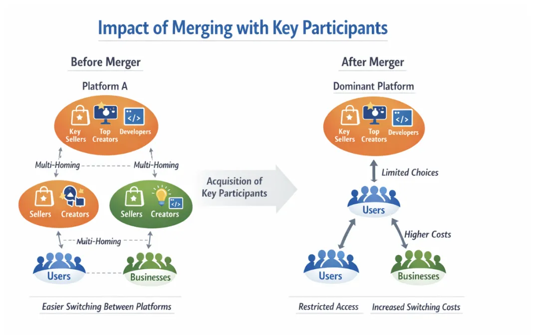 在多边平台结构中,平台价值很大程度取决于关键参与者的规模与质量,尤其是能够显著吸引另一侧参与者的“锚定型”主体。当支配平台将此类关键参与者纳入自身体系后,一方面可能使竞争平台在招募同类参与者时面临更高成本或更低成功率,进而削弱其获取间接网络效应的能力;另一方面,关键参与者被“锁定”在主平台内,也会降低用户、商家或开发者在不同平台之间多归属(multi-homing)的意愿,抬高跨平台切换成本,使竞争平台更难以形成足够规模的双边(或多边)增长循环。