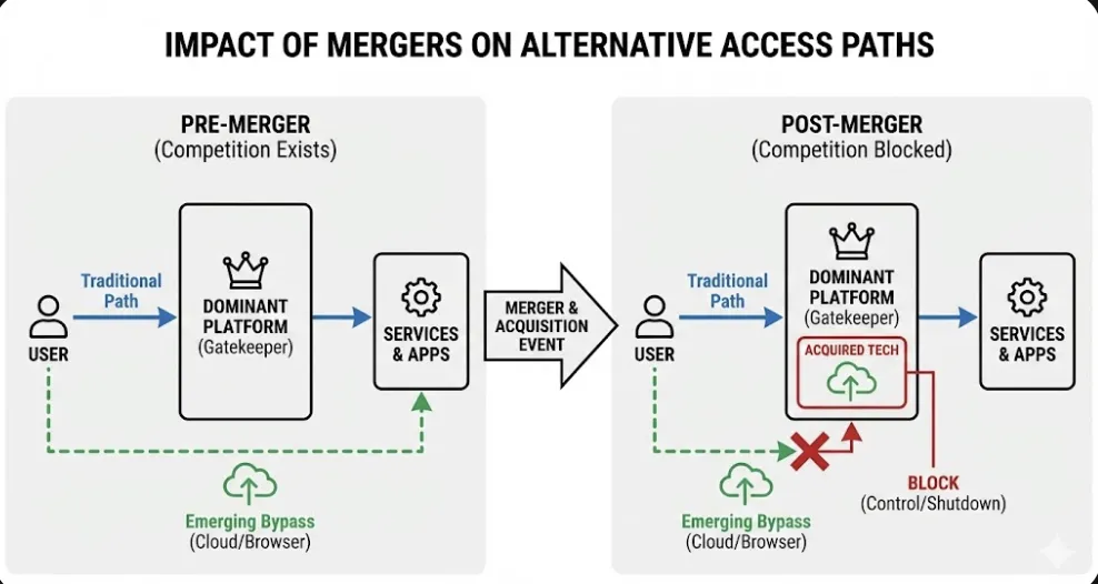 举例而言,在操作系统或应用商店等入口型平台领域,若云端应用、浏览器端运行等技术路线逐步成熟,使用户无需依赖特定系统或应用商店即可使用复杂软件与服务,那么这种技术转型本身就可能创造出新的满足需求方式,进而弱化既有平台作为必经入口的地位。正因如此,当平台处于支配地位时,《合并指南》强调应警惕平台通过并购、控制关键技术或关键服务等方式,将这些“降低依赖/替代功能”的路径在萌芽阶段提前封堵。