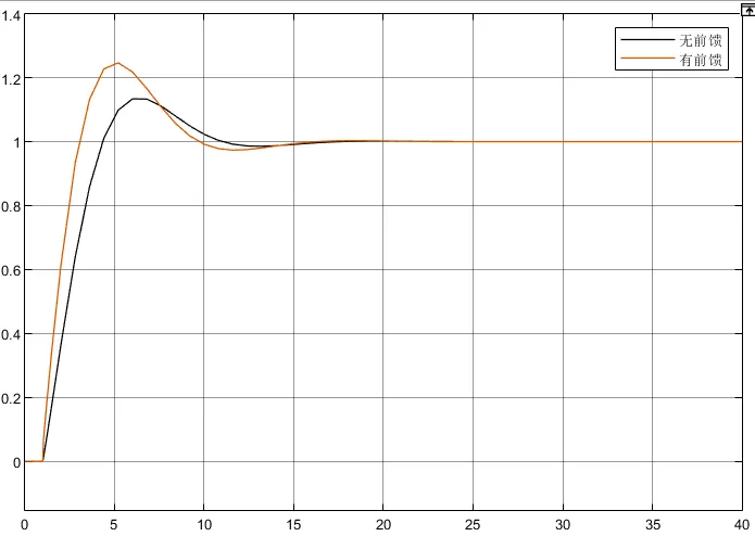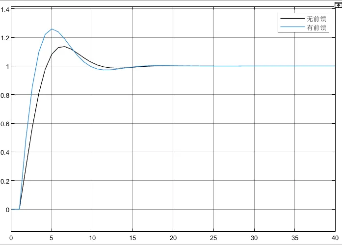 在相同的PI控制器下对比有无前馈时的响应如下,可以看到由于前馈在初期加入了一个值,超调会大