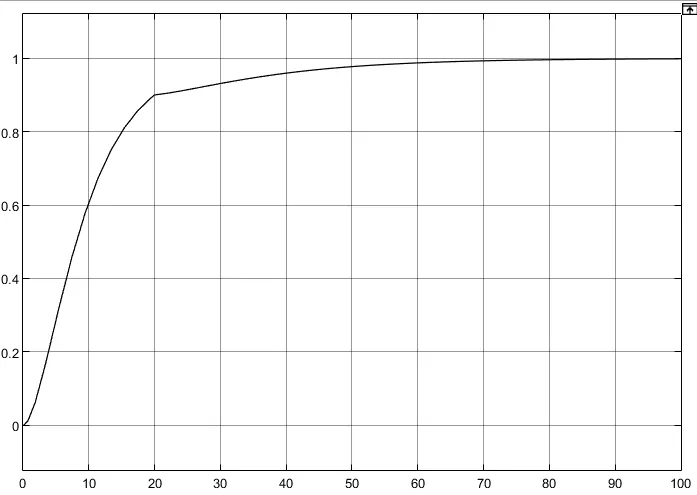 这是因为涉及微分环节,而阶跃信号的微分为无穷大,在阶跃信号后接一个时间常数很小(0.01)的惯性环节作为滤波器,再次仿真,可以看到输出信号立刻上去,且调节时间也很短。