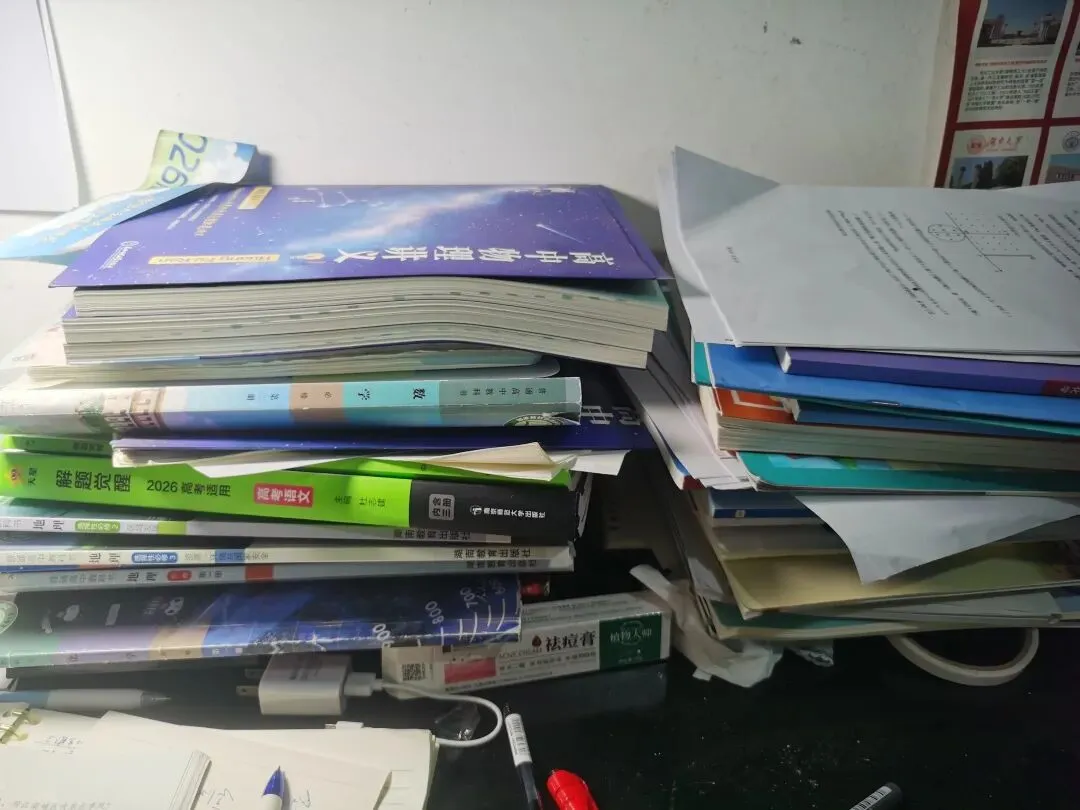 看着桌子上堆积如山的学习资料,我随手翻查了几下,竟说不清她到底攒了多少:物理《黄夫人》、《解题觉醒》,一本本封皮都还是崭新的;语文《文学常识》、《作文素材》,整齐地摞在角落里;数学《秋龙数学大招》赫然在列……还有一沓沓打印出来的习题卷、知识点总结,白纸黑字铺满了小半张书桌,看着确实几分阵仗。