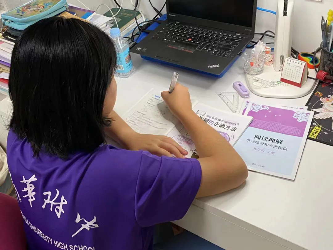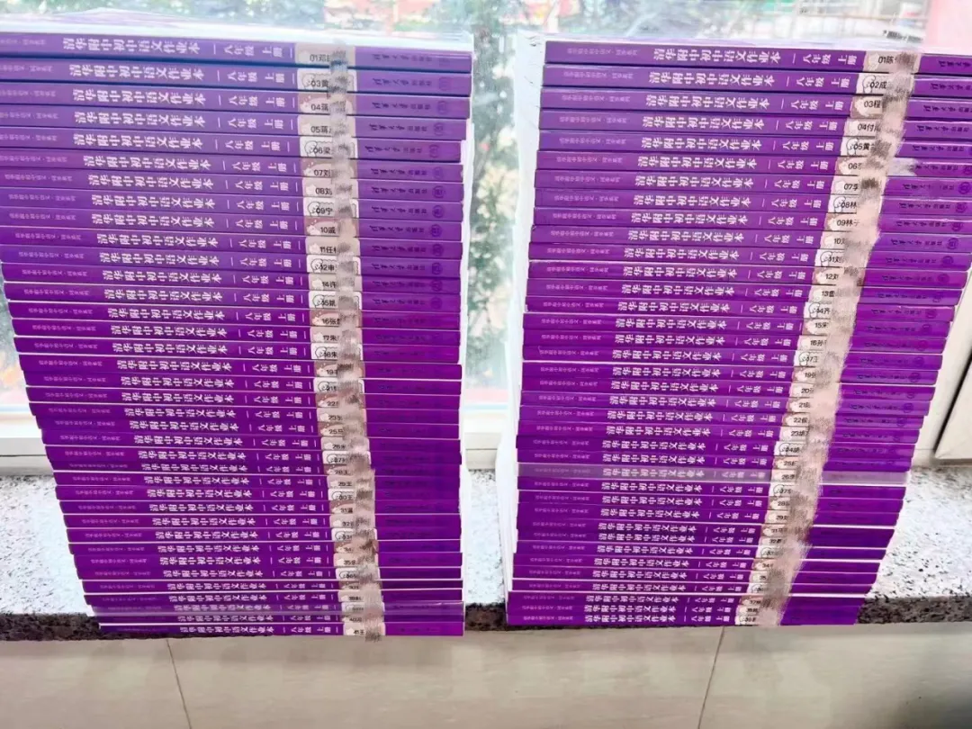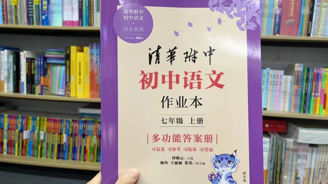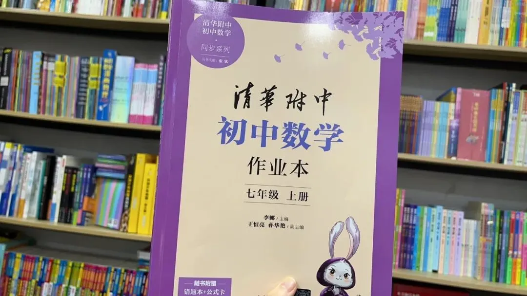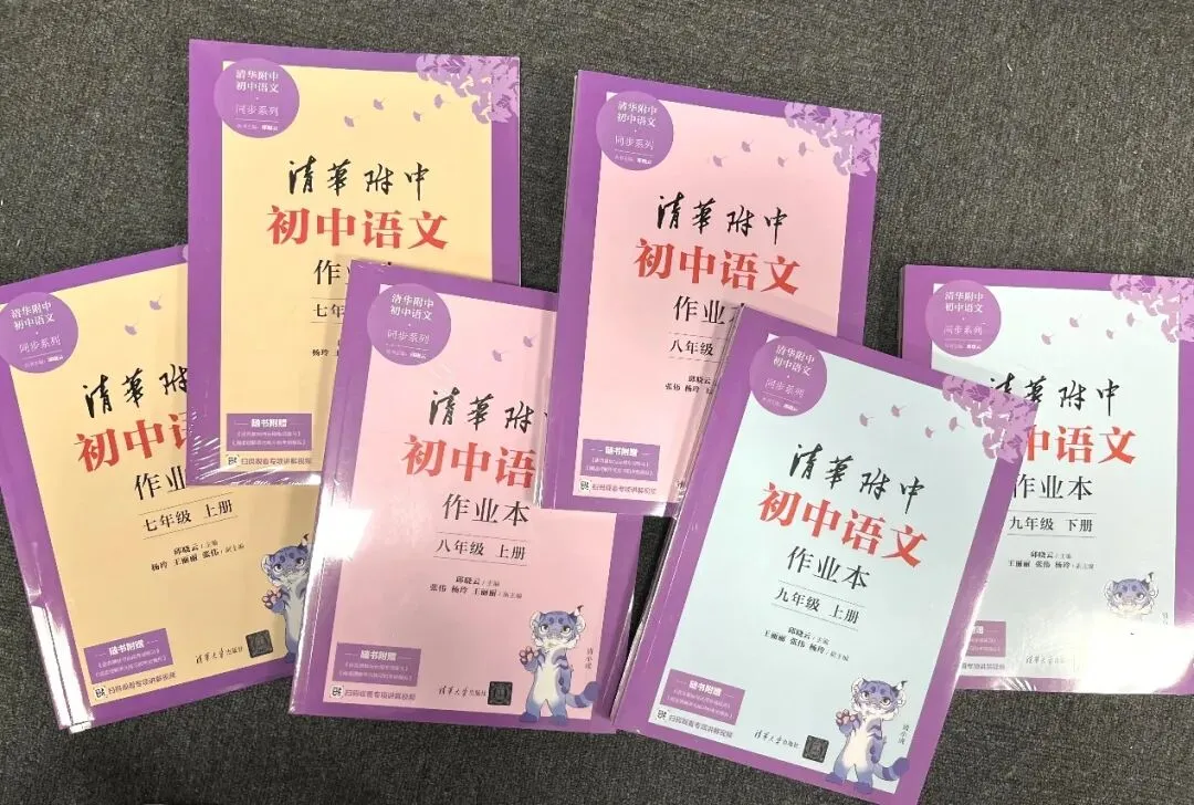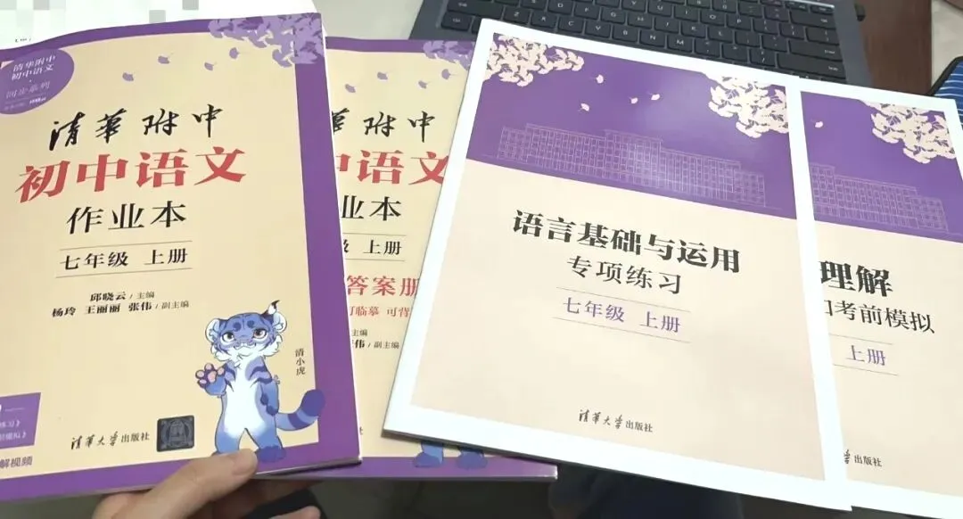 而每本书的封面上赫然写着“清华附中”、“初中语文”、“初中数学”、“作业本”这几个醒目的大字。