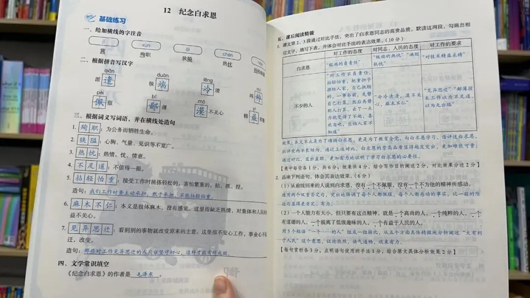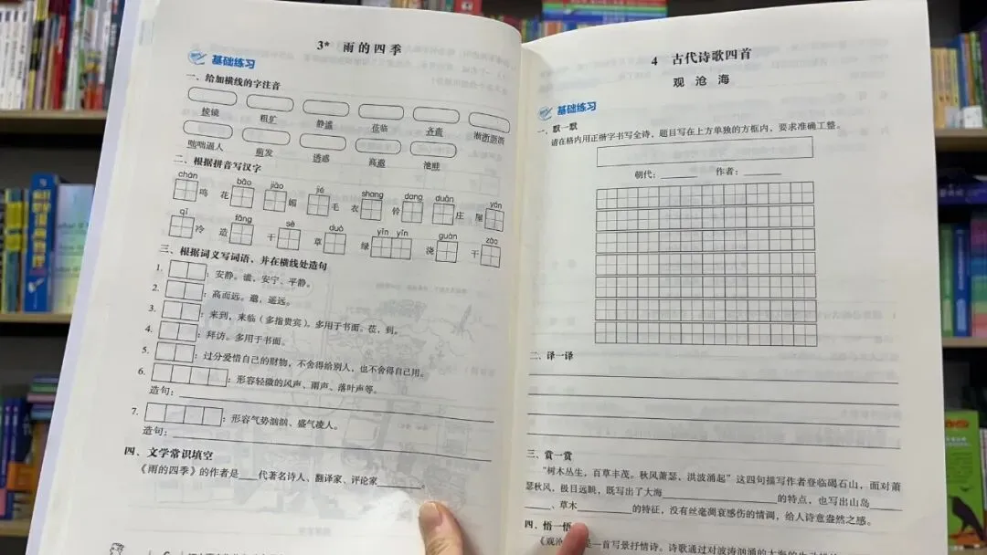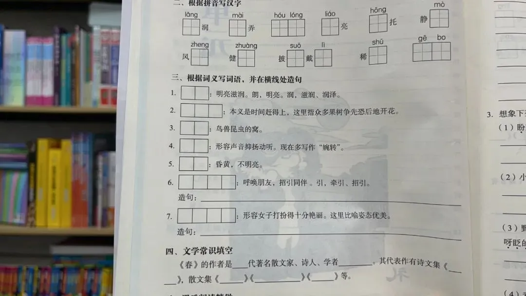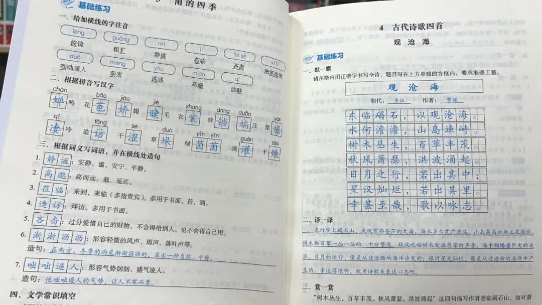 而针对这些考点,练习册里就设计了注音、写字、词义理解与运用、文学常识和课后阅读精做这几种题型。