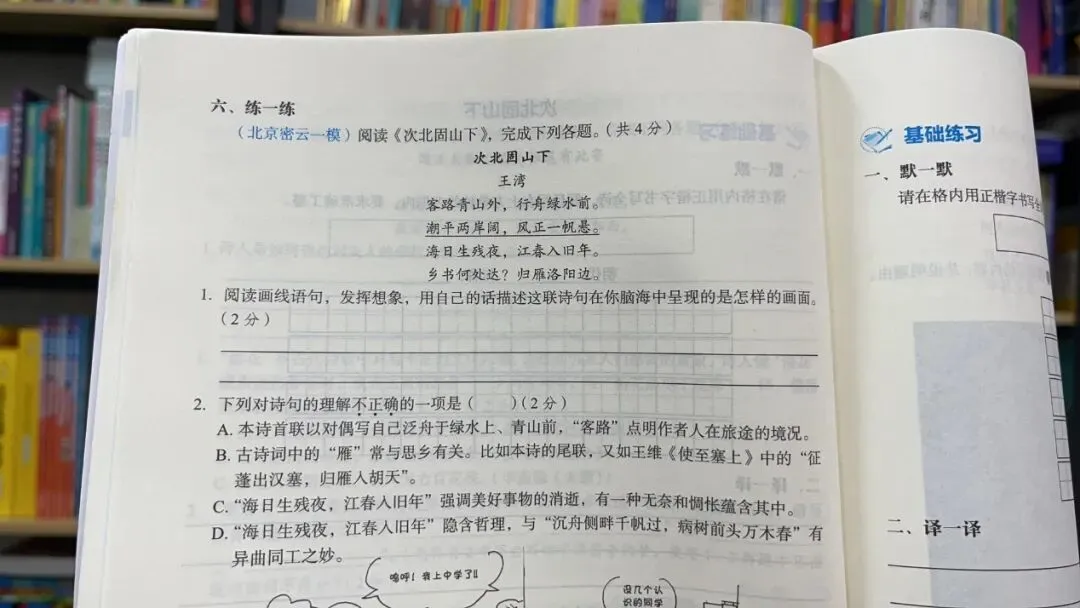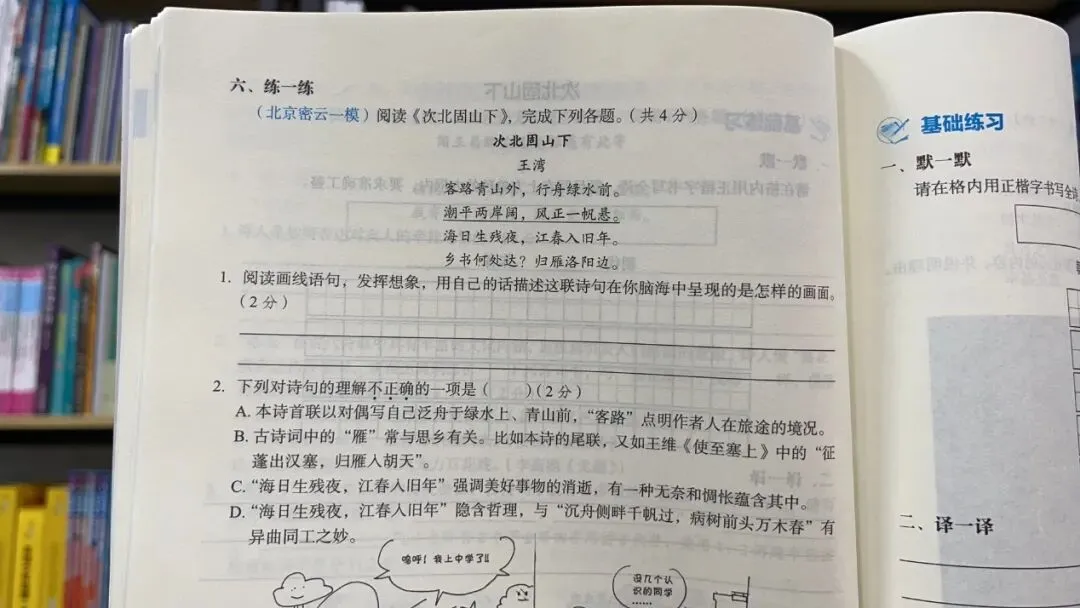 而《次北固山下》的阅读理解题则直接选自北京密云的一模真题,阅读材料依然是课本中的完整诗词。