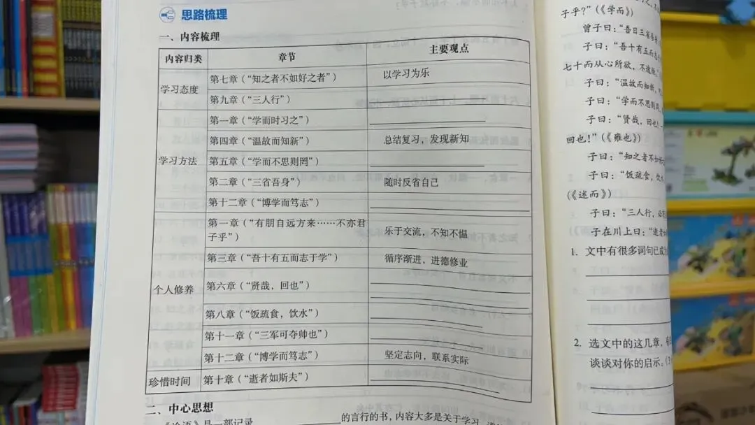 接下来会用这样一个表格梳理《论语》,帮助孩子理清全文的结构和思路。