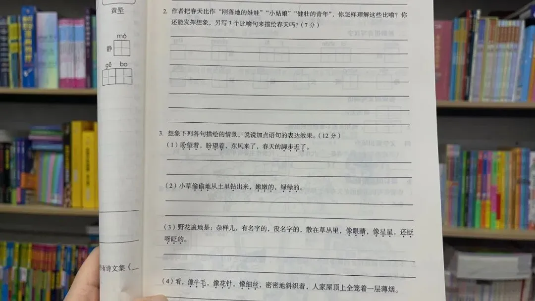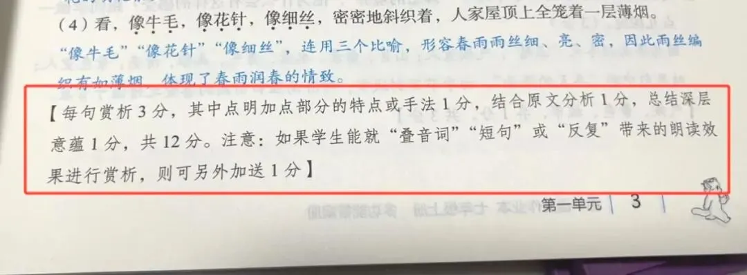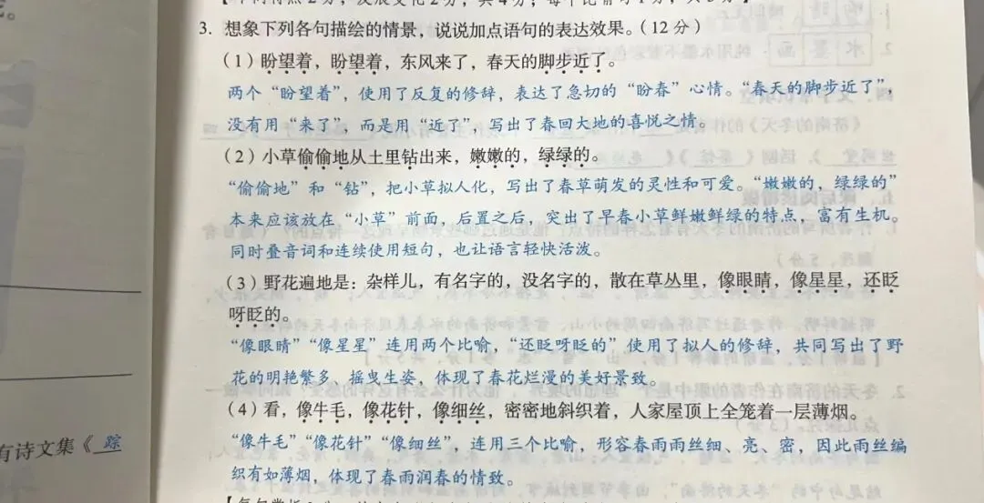 就比如上面提到的课文《春》,这是它的阅读理解题,考查的是赏析修辞手法、仿照例子造句、分析加点词的表达效果。