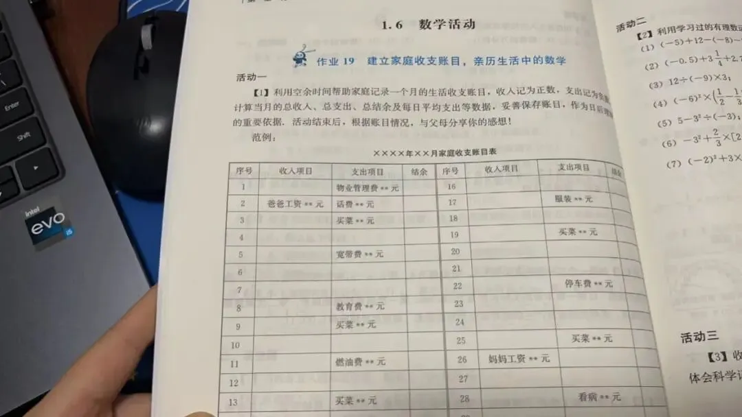 就比如学完有理数的知识,书中会让孩子们做一个家庭收支账目表。