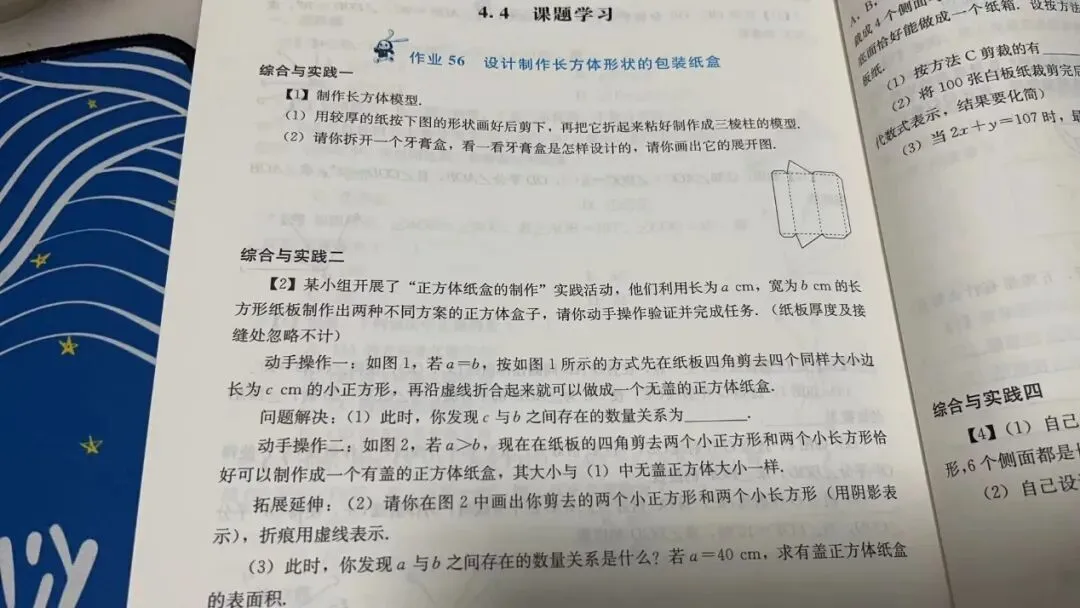 而学几何章节的知识之后,书中设计了一个课题,让孩子根据要求制作三棱柱模型、动手拆开身边的纸盒看看它的设计原理等等。