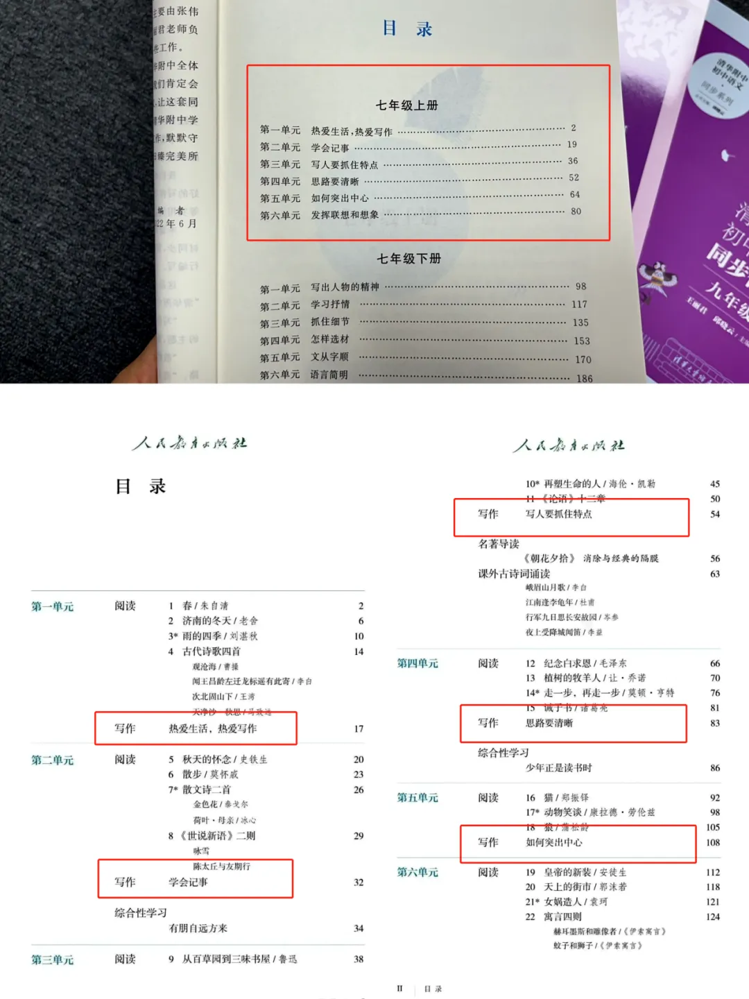 我展示一下七年级分册的目录,你看,书里每个单元都和教材里各单元的写作主题一一对应: