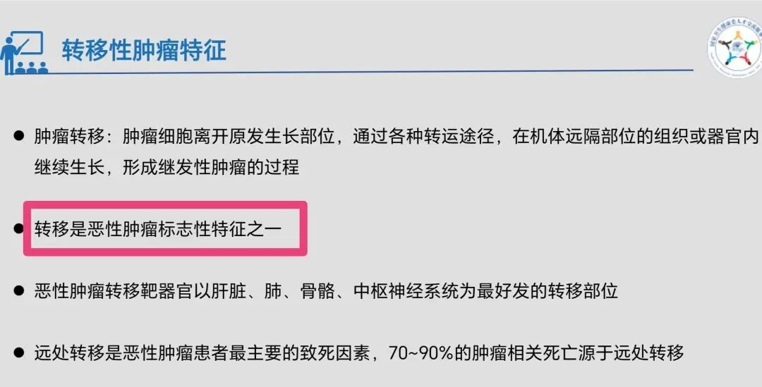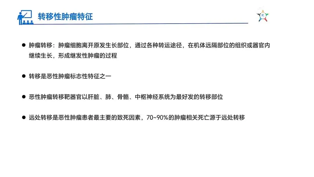 肿瘤转移是恶性肿瘤细胞从原发部位扩散至远隔器官的过程,常见转移靶器官为肝、肺、骨骼、中枢神经系统。远处转移是肿瘤主要致死因素(70–90%肿瘤相关死亡源于转移)。