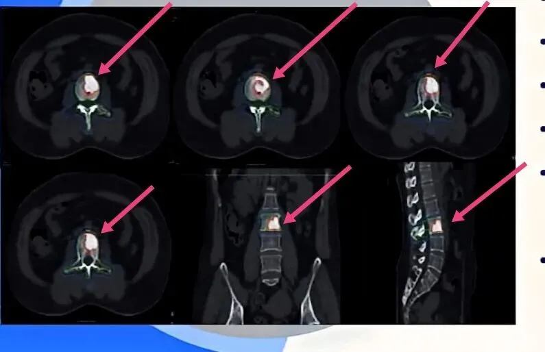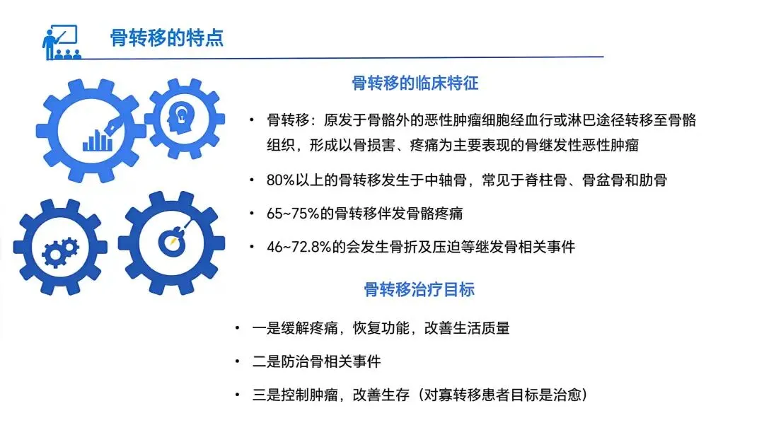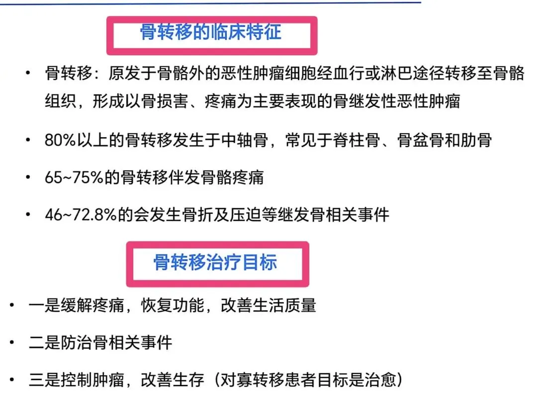 临床特征:80%发生于中轴骨(如脊柱、骨盆),常伴疼痛、病理性骨折等骨相关事件(SREs)。