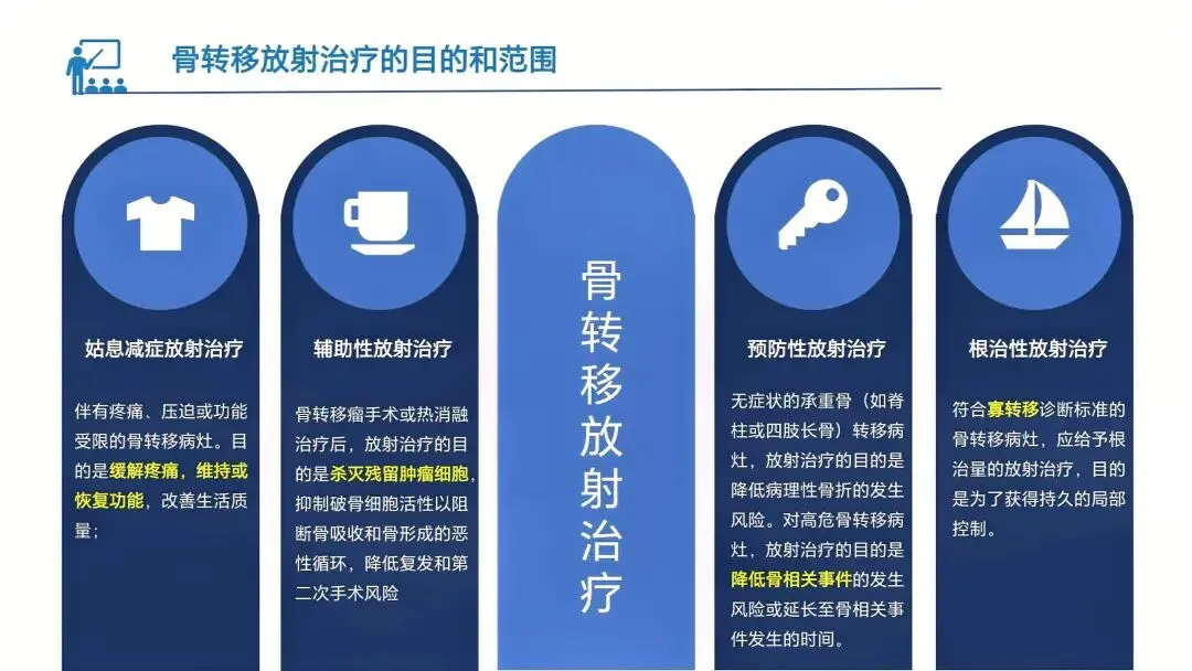 姑息减症:缓解疼痛/压迫(如骨转移疼痛、脑转移颅高压)