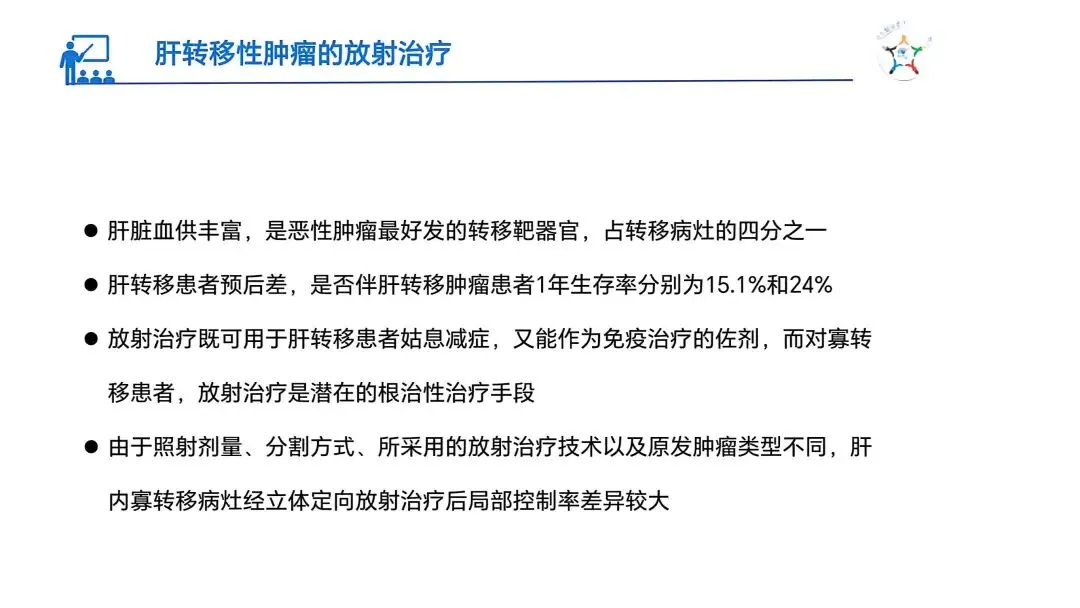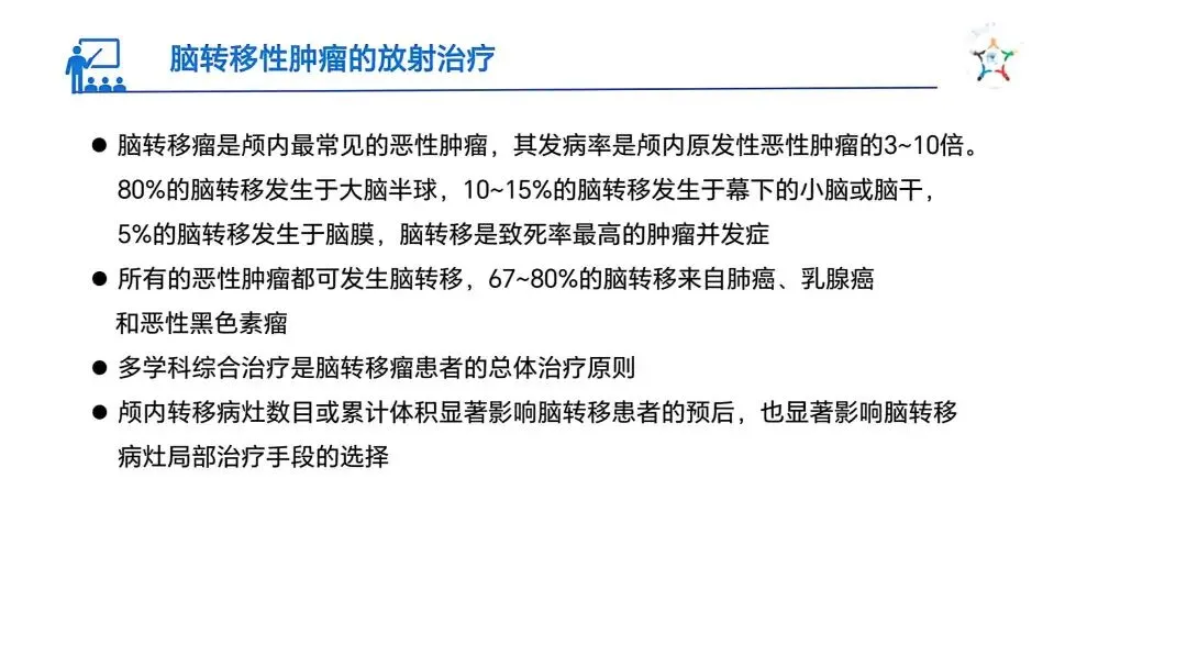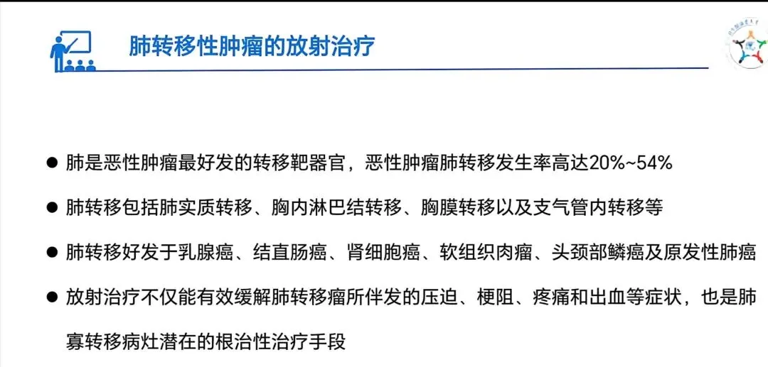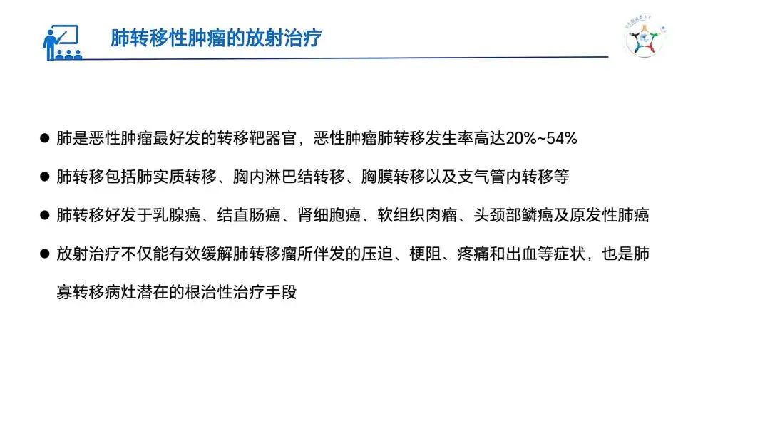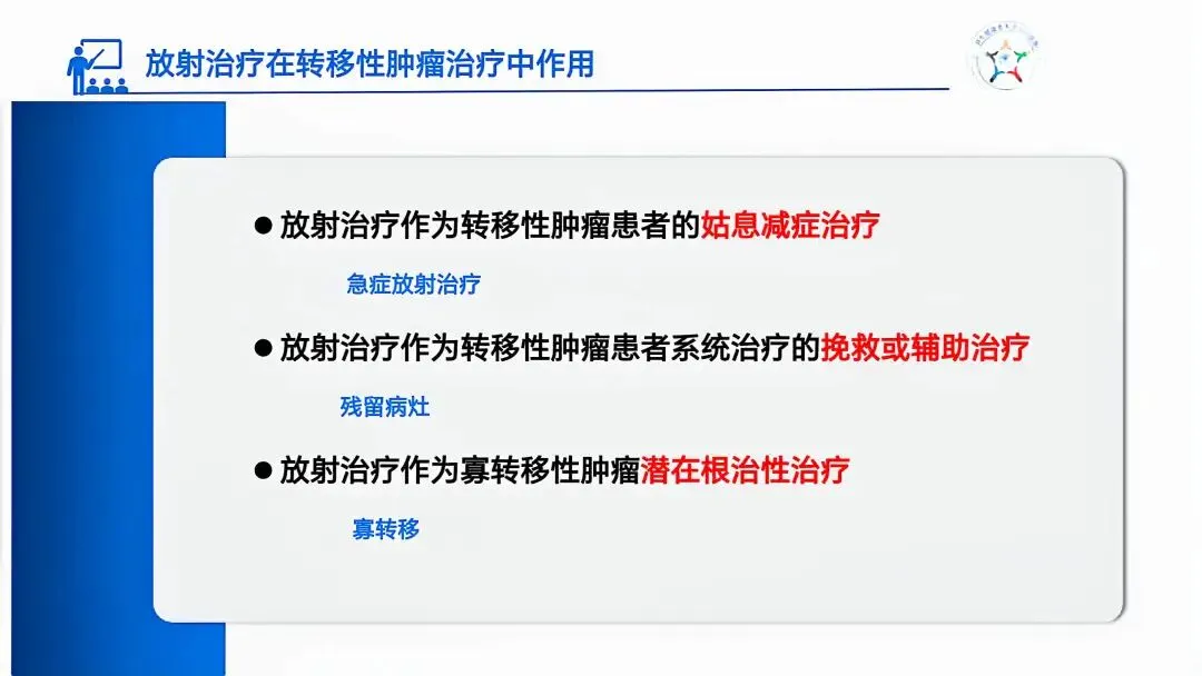 放射治疗在转移性肿瘤中不仅用于姑息减症,还在寡转移(Oligometastasis)场景下具备根治潜力。PPT强调多学科综合治疗原则,并详细介绍了立体定向放射治疗(SBRT/SRS)等先进手段的临床应用。以下分模块总结知识点,并解析重要内容的底层逻辑。