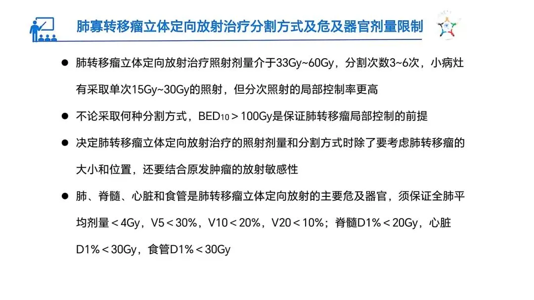 立体定向放疗(寡转移):潜在根治手段,局部控制率依赖BED10>100Gy。