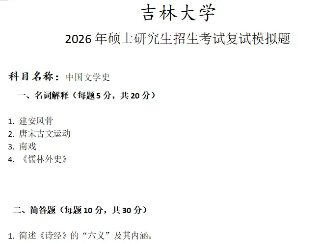 吉林大学中国文学史考研复试真题模拟含答案