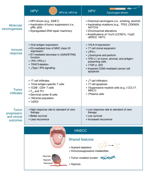 HNSCC的免疫异质性与HPV状态相关,驱动不同的免疫发病机制。HPV阴性肿瘤由致癌物诱导,表现为免疫抑制性TME,伴随TAM、MDSC积累和PD-1+ Th1细胞增加;HPV阳性肿瘤则因病毒抗原引发免疫反应,富含CD4+/CD8+ T细胞和HPV特异性T细胞,但也存在耗竭和免疫逃逸。基因组异质性、免疫编辑及HPV表达差异进一步促进免疫逃逸,影响免疫治疗效果。