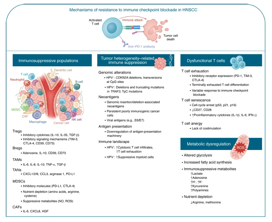 恶性肿瘤可在TME中招募或形成不同类型的抑制性细胞,如Tregs、肿瘤相关中性粒细胞(TANs)、MDSCs、TAMs和癌相关成纤维细胞(CAFs),这些细胞促进癌症进展和免疫逃逸,并诱导HNSCC中的免疫治疗耐药。