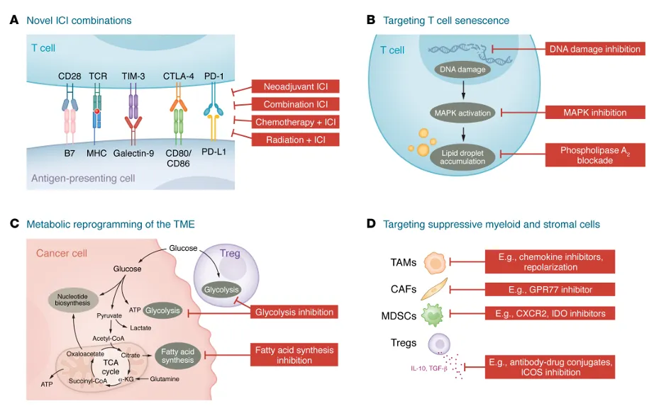 靶向T细胞衰老是肿瘤免疫治疗的新兴策略,旨在恢复效应T细胞功能,增强免疫反应。Tregs和肿瘤细胞作用:通过诱导效应T细胞DNA损伤导致衰老。阻断DNA损伤:可防止T细胞衰老并增强抗肿瘤免疫。联合治疗:α-PD-L1与DNA损伤抑制剂联合可协同增强免疫疗效。MAPK信号通路:其激活是衰老的重要机制,阻断MAPK信号可提高α-PD-L1疗效。靶向免疫抑制性髓系和基质细胞