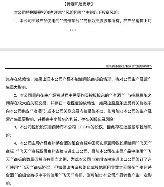然后是《特别风险提示》,证监会真是用心良苦啊,告诉大家企业当前存在的最大风险,别说我没有告诉你好,你如果亏钱了不怨我。可以看到,在2021年,贵州茅台最大的风险有4点,第一点是“贵州茅台”的商标归大股东贵州茅台有限公司所有,产品销售上存在依赖,万一不能使用这个商标,比如只能叫“贵州春”,会对公司经营造成很大的影响;第2点是在因为贵州茅台酒是用当年产的酒和老酒勾兑而成,而老酒目前都属于大股东,需要购买,构成关联交易,而且如果大股东不卖或者卖贵了,都会对公司的经营产生重要影响,而且会损害中小股东的利益,存在关联交易风险;第3点是上市以前大股东持有公司90.81%的股权,存在控制风险;第4点是由于历史原因,“飞天”商标属于贵州省粮油进出口公司,而公司生产的产品中使用“飞天”商标仍占相当比例,因此公司与贵州省粮油进出口公司签订了“飞天”商标使用协议,如果该协议被中止导致无法使用“飞天”商标,会对公司产品销售产生一定的影响。对于上述问题,后文中会有解决方案,这里先卖个关子,大家也可以思考一下,毕竟我们现在是站在25年后的今天往前看,算是上帝视角。