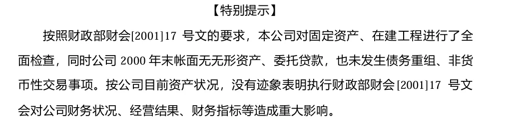 最后是《特别提示》,根据财政部(2001)17号文的要求,对固定资产、在建工程、无形资产、委托贷款、债务重组、非货币交易等方面进行再次核查,无重大影响。