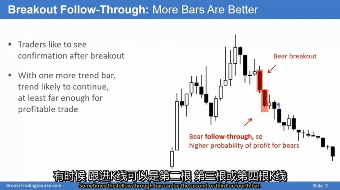 确认机制:交易者喜欢在突破后看到确认信号,例如空头突破后出现更多趋势K线,则趋势可能延续至有利可图的幅度