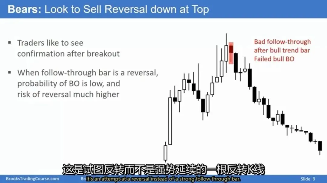 失败信号:当跟随K线是反转K线时,突破成功的概率低,反转风险显著增加