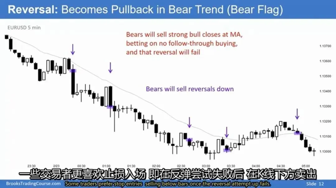 空头交易策略:在空头趋势中,当市场首次触及均线时,空头会抛售位于移动平均线附近的强势阳K线的收盘价,押注多头反转尝试会失败,没有多头阳线跟随K线。