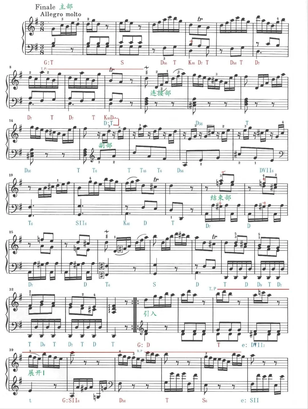 结束部(23-34):结束部延续副部的D 大调调性,核心功能是巩固副部调性、收束呈示部音乐材料,形成完整的段落闭环。织体设计独具匠心,左手采用分解式织体,保持音乐的流动感;右手以双音旋律形态为主,增强旋律的表现力与厚度。第 23-24 小节后,旋律音程明显拉大,形成音乐张力的短暂提升,随后通过两小节的音级过渡,衔接核心动机的连续快速进行,节奏密度加大,推动音乐向收束方向推进。和声方面以主属和弦的交替连接为基础,通过明确的和声逻辑强化调性稳定性,为呈示部画上圆满句号。