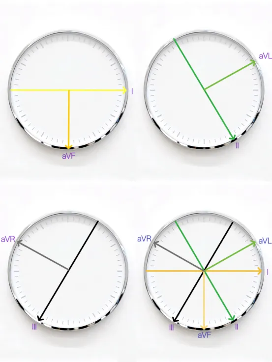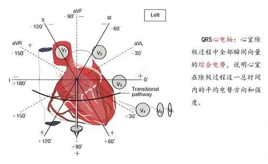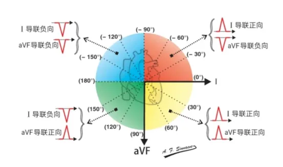 当Ⅰ导联R波为主, QRS电轴在钟表的左半部分象限。当aVF导联R波为主, QRS电轴在钟表的下半部分象限。当Ⅰ导联和aVF导联皆以R波为主, QRS电轴在钟表的左下象限,为正常电轴。当Ⅰ导联和aVF导联皆以S波为主, QRS电轴在钟表的右上象限,就是我们常说的无人区电轴。其余同理。