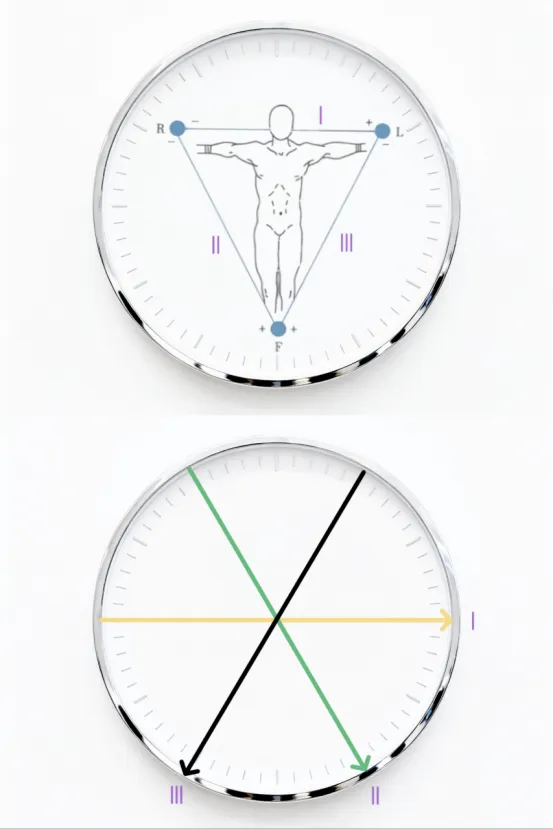 各导联是记录心脏不同部位的电位差。右上肢和左上肢之间为Ⅰ导联,在3点钟方向;右上肢和左下肢之间为Ⅱ导联,在5点钟方向;左上肢和左下肢之间为Ⅲ导联,在7点钟方向。