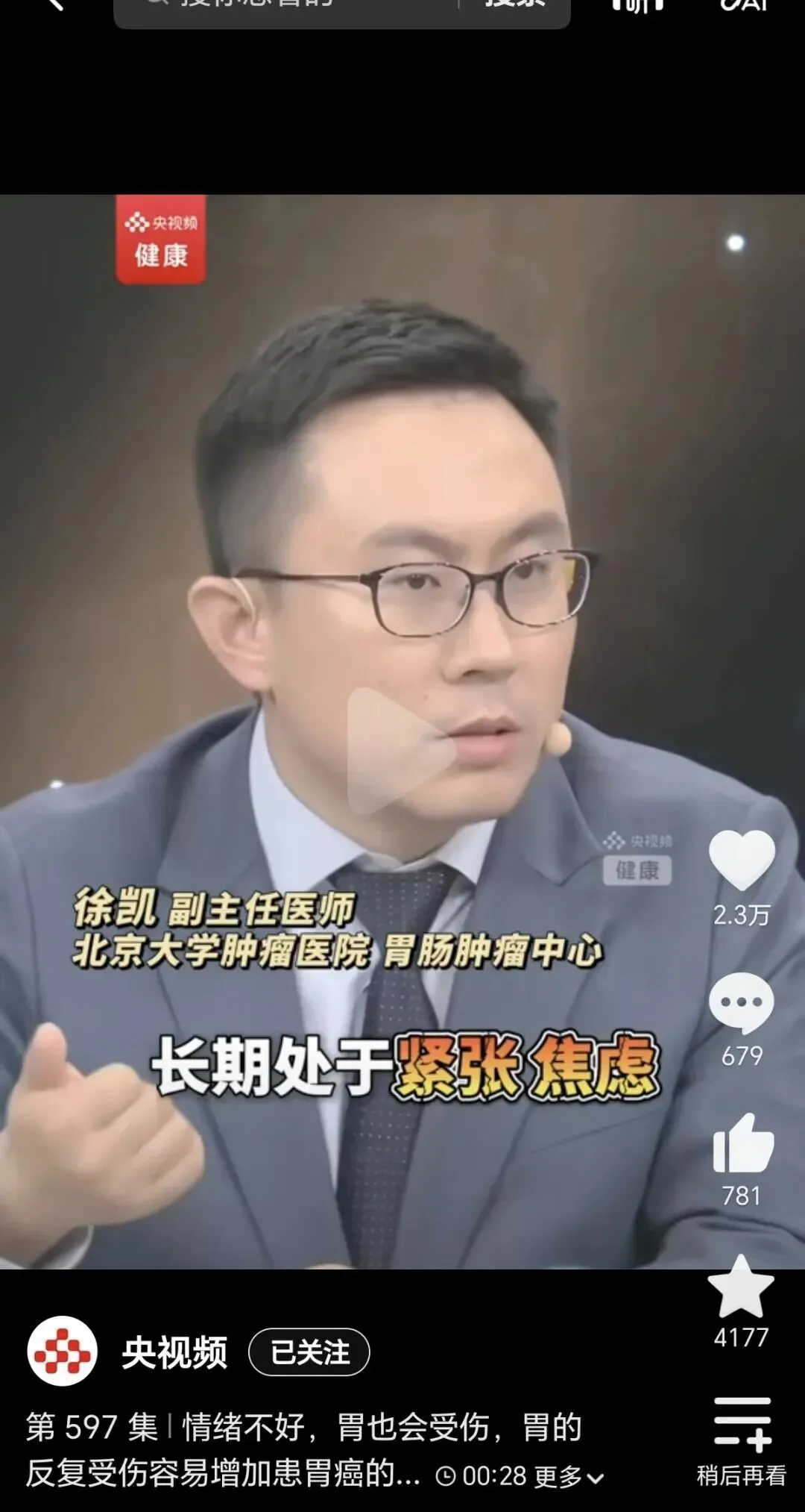 央视频 北京大学肿瘤医院 胃肠肿瘤中心,徐凯副主任医师提到好胜心强,容易激动、长期处于紧张焦虑、压抑情绪状态下的人,他的胃癌的发生率是明星增加的。