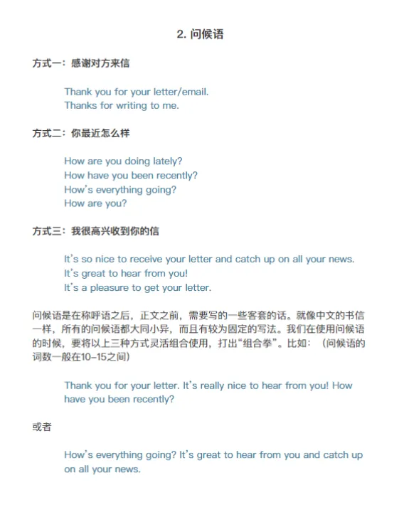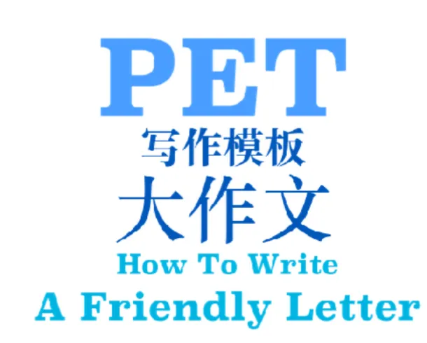 pet大作文有两种类型,书信和续写故事。本模板中,我们只介绍书信的写作方法;同时,我们也建议各位考生选择书信的题目,放弃续写故事。PET大作文的具体要求是写一篇字数在100词左右的电子邮件或者非正式信件。该部分的书信写作类型通常是写给朋友的非正式书信。非正式书信的写作有其固定的模板,包含称呼语、问候语、过渡语、正文、结尾、签名几个部分。在正文部分,我们需要掌握几个最重要的语言功能,例如,表示顺序,表示建议,表示转折、表示递进、表示因果的建议功能。