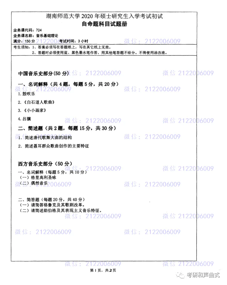 ● 院校真题|2020湖南科技大学 音乐考研 620中外音乐史 真题