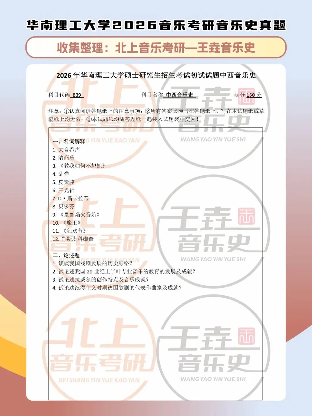 >华南理工大学2026音乐考研音乐史真题|北上音乐考研-王垚音乐史工作室收集整理