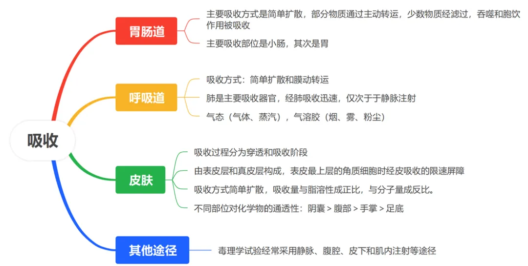 吸收是外源化学物从机体的接触部位透过生物膜进入血液的过程。吸收的主要部位是胃肠道、呼吸道和皮肤。毒理学研究中还采用特殊的染毒途径,如腹腔注射、静脉注射、皮下注射和肌内注射等。