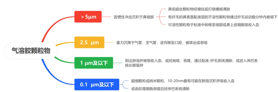 气溶胶:雾的吸收和气态物质类似,受脂溶性和吸入浓度影响。烟和粉尘的颗粒直径大小与其到达呼吸道的部位关系密切。