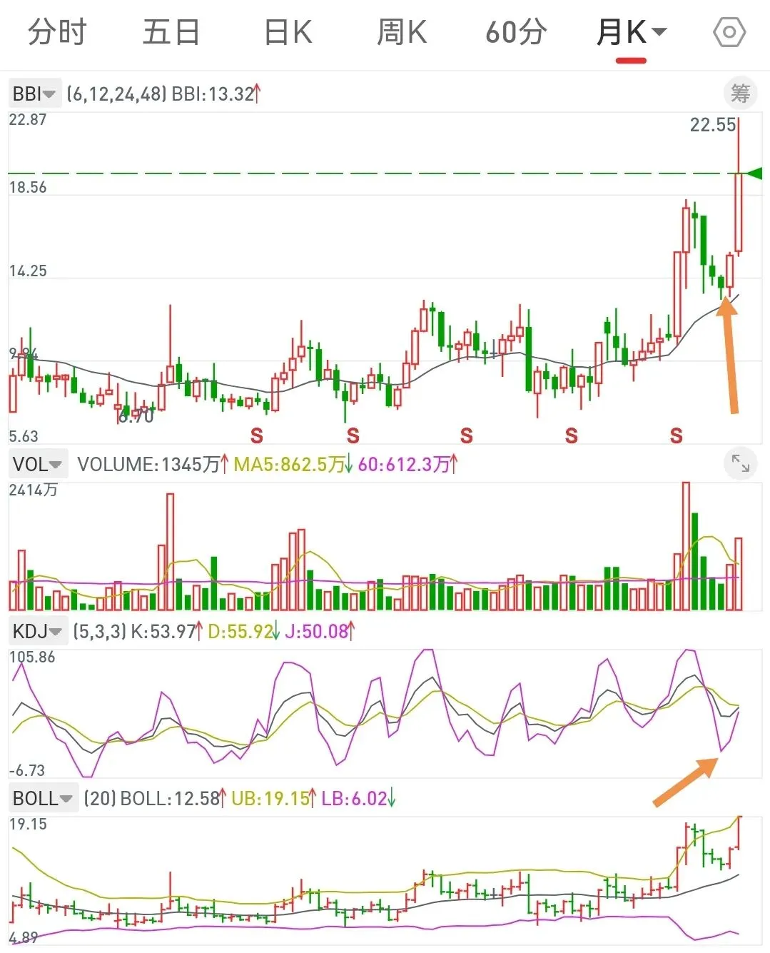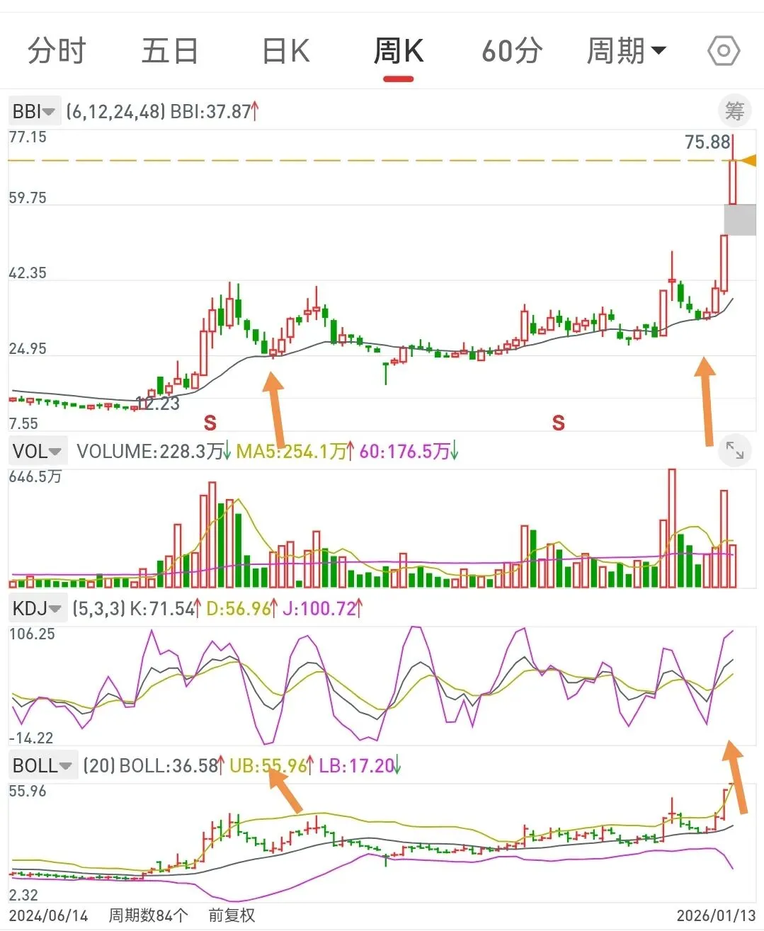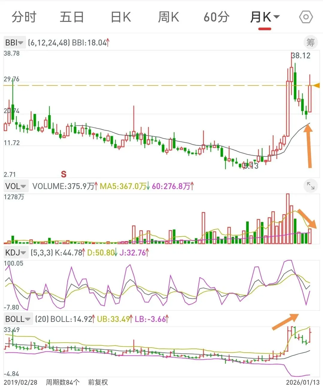 2、如果时间周期(按4天为标准,有时上下浮动1天)满足、BBI满足、J大负值满足,缩量止跌,会形成一个共振买入机会。