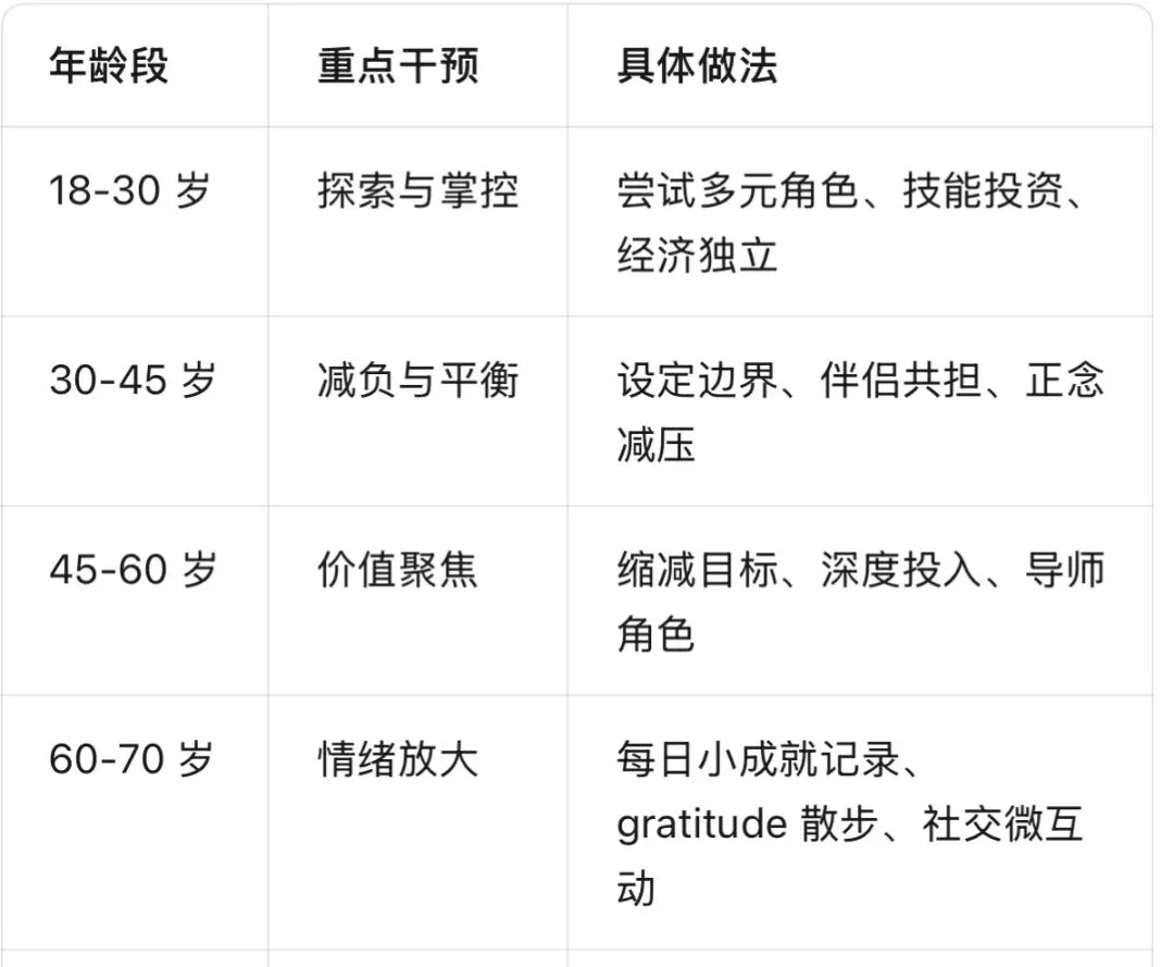 • 微降(70+):健康损耗、伴侣丧失、社交圈缩小→抵消情绪收益,但仍高于平台期。