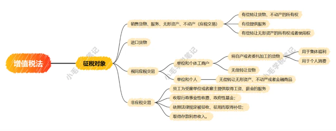 第三条讲了什么是应税交易,是【有偿】,第五条讲了无偿的情况,需要视同应税交易,第六条,又描述了不属于应税交易的情形(在实施条例第二十二条里定义为非应税交易),思维导图如下: