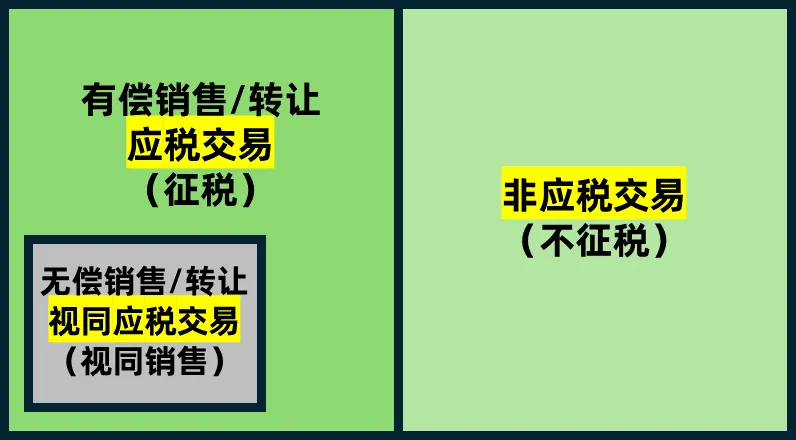 须区分“有偿”与“无偿”判定 根据《增值税法》第一条与第五条的组合逻辑,答案是:有偿转让属于应税交易,无偿转让不属于视同销售。