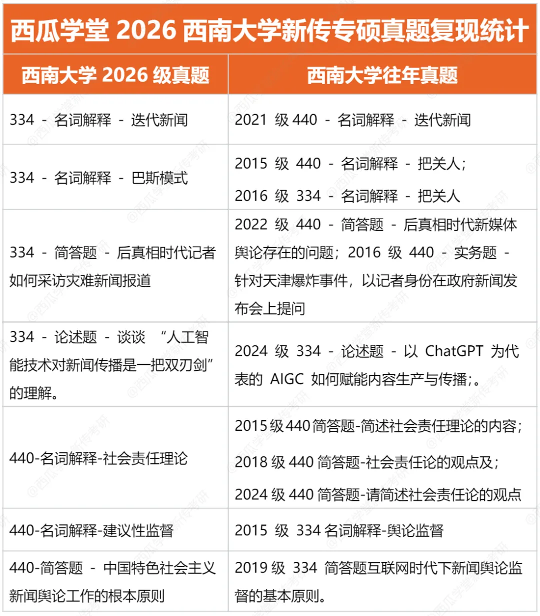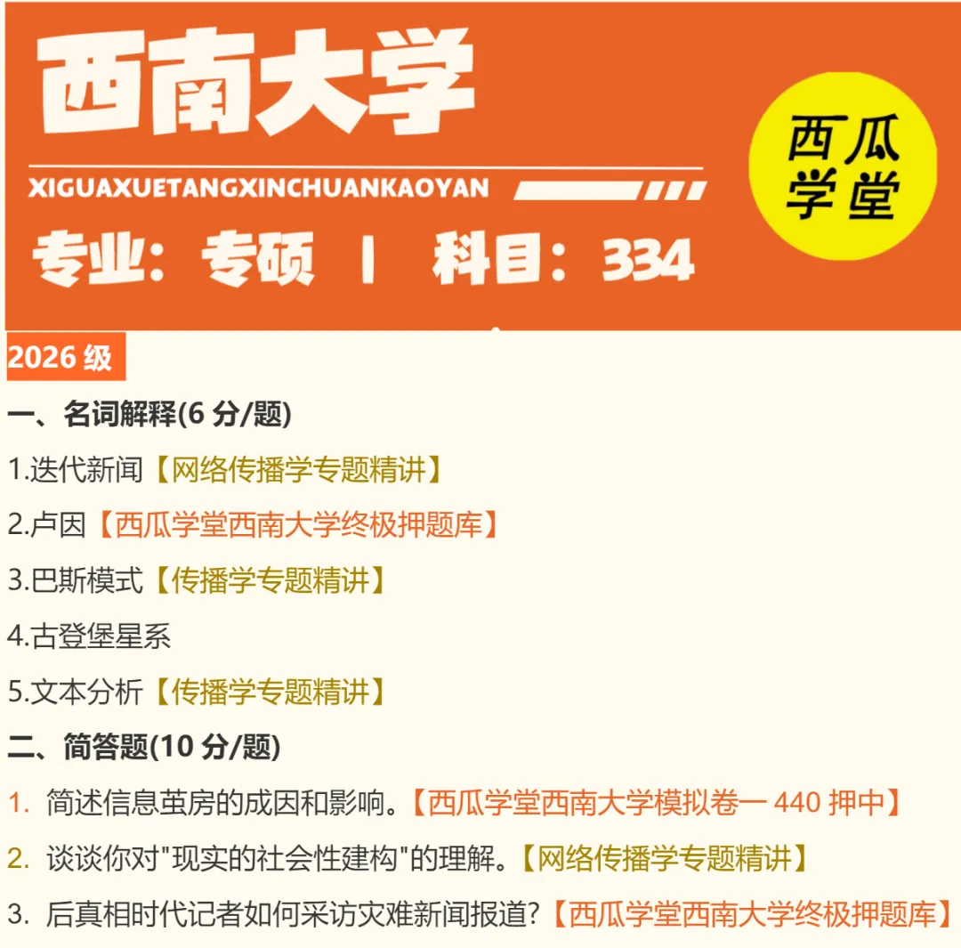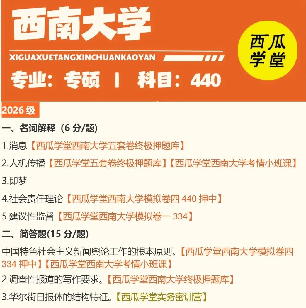 包含西南大学新传专硕2015-2026年最具参考性的近10年的最新专硕真题,以及2021-2026高分学长姐撰写的考场回忆版完整答案+考题点拨!