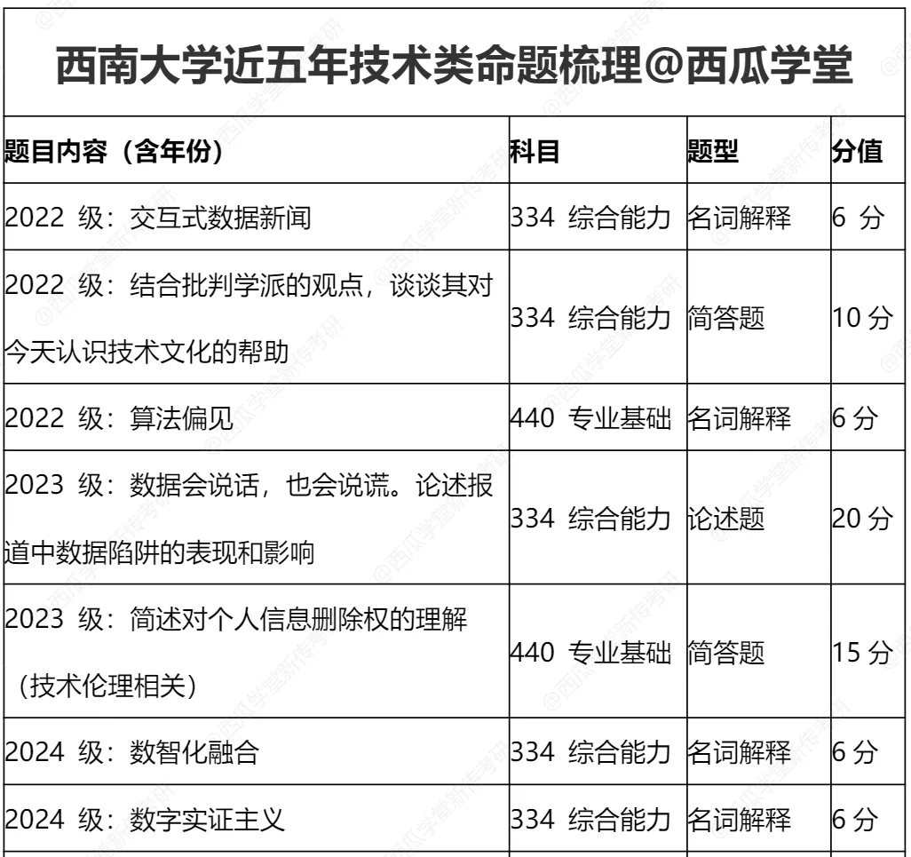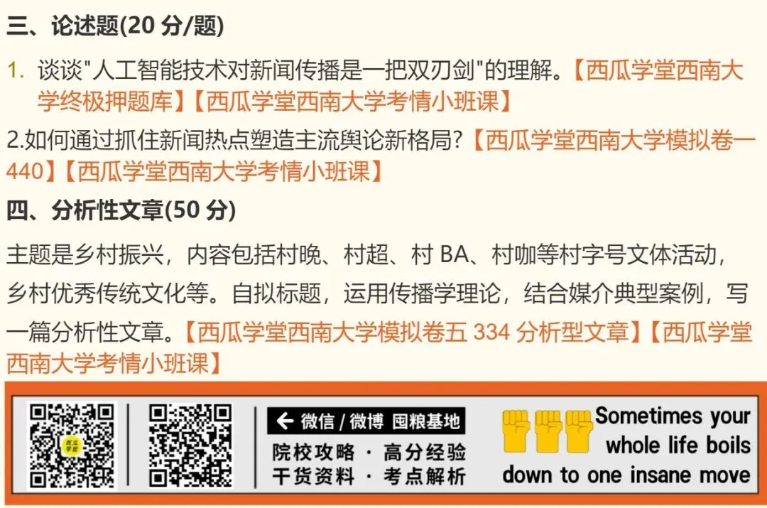 可别小看这个变动,研究设计和其余实务写作的逻辑完全不同,且因为西南大学往年只有学硕考核研究设计,专硕的实务考核的相对稳定,一般都是消息、评论、分析型文章,年年都是老三样,所以好多宝子备考时压根没把研究设计当重点,结果考场上直接懵圈,内心 OS:西南大学,我到底该拿什么爱你?