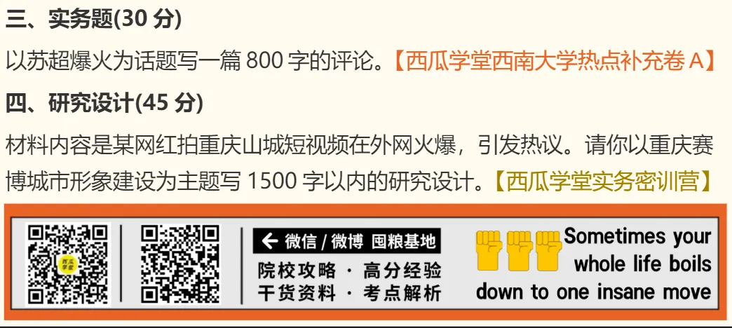 西南大学的实务题目和论述等大题,这类题目重点稳定,基本没有超纲题,很多题目都可以提前准备到。比如“苏超“这道题西南大学考核的是评论,而堂堂西南大学五套卷热点卷中直接把一篇“苏超”相关的评论文章放在题目中。加上西瓜学堂实务密训营每周实务热点宝库中也给大家梳理好多篇苏超的评论文章,所以这个实务相对来说是大家准备得比较好的一个。