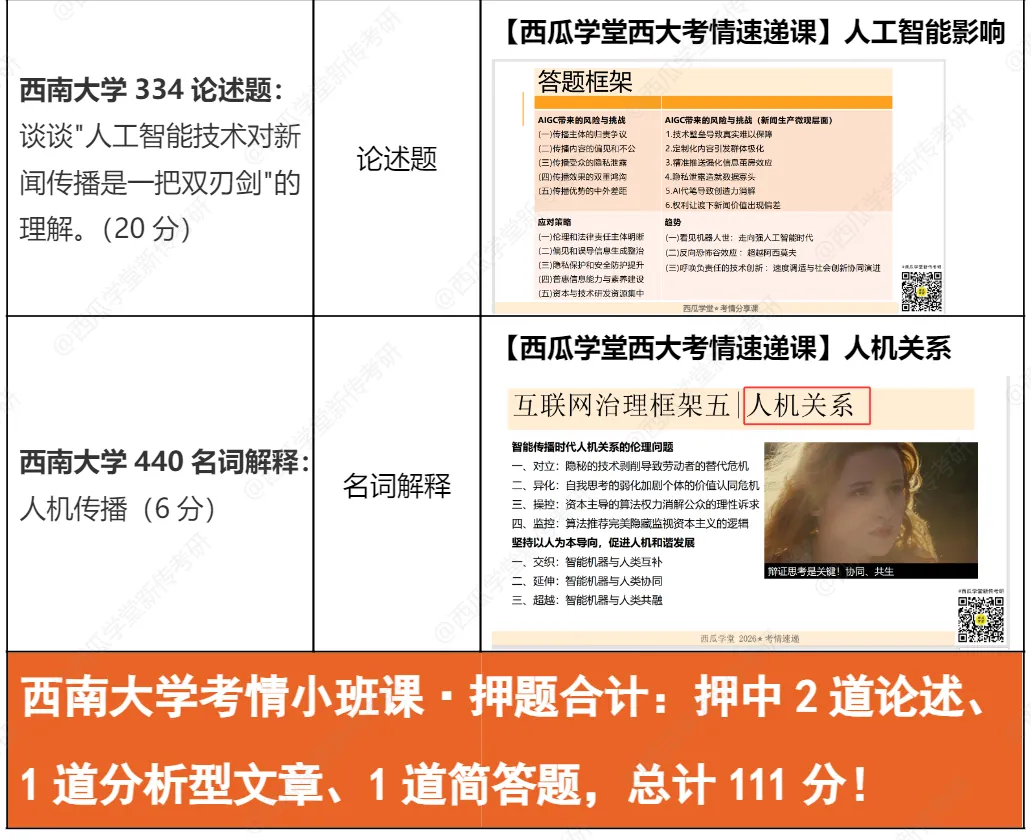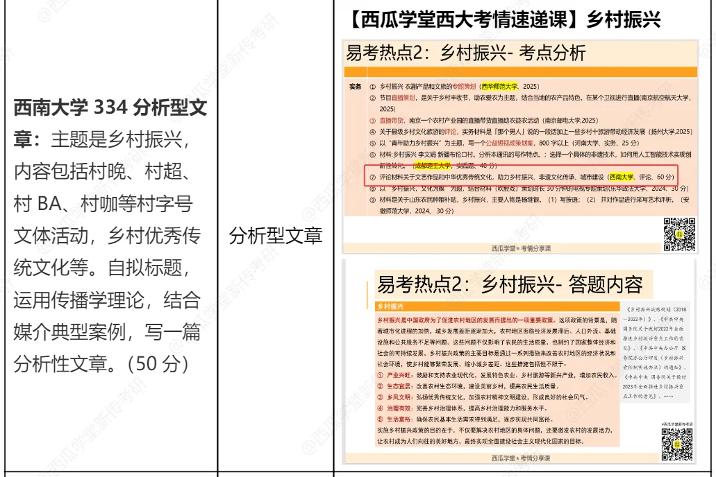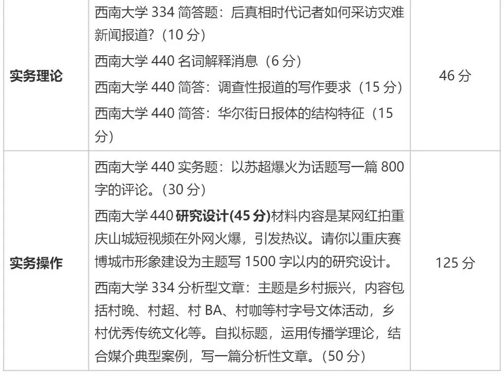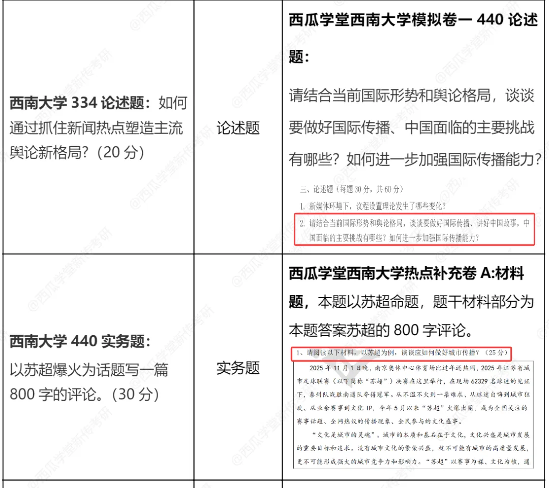 能发现西南大学实务部分有几个规律:一是重视考核国家战略/社会热点,乡村振兴是国家战略,主流媒体改革是传媒领域国家重点方向;二是文化传播/文体热点,如体育饭圈、苏超等;三是地域特色,重庆赛博城市形象,西南大学在重庆,地域关联明显。