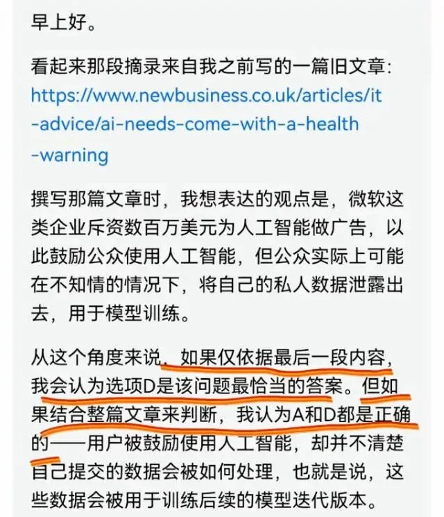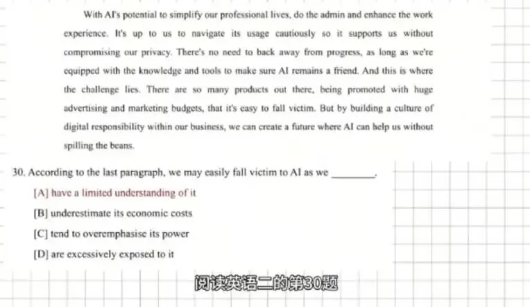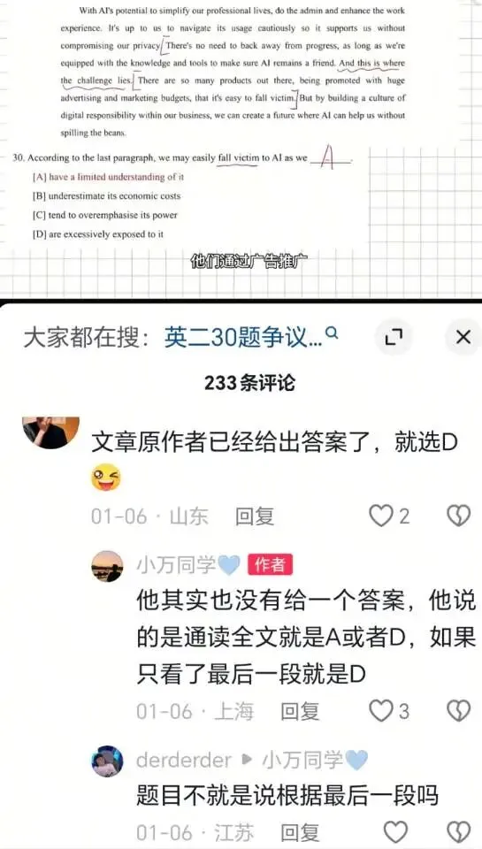 2026年考研英语二第30题的争议主要集中在选项A和D之间,作者对此的回复如下: 作者观点:根据文章最后一段,选项D更合适;但从文章整体来看,A和D都正确。用户被鼓励使用AI,但可能未意识到自己的数据被用于模型训练。争议原因:不同考生对文章的理解和侧重点不同,导致选择不同。部分考生认为选项A更符合文章主旨,而另一些考生则认为选项D更直接对应最后一段的内容。