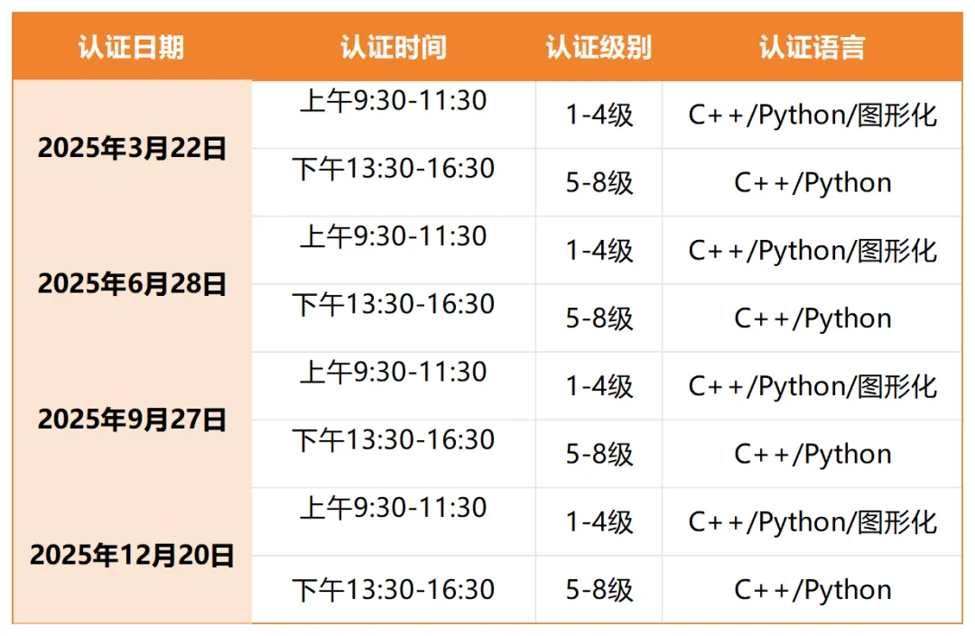 GESP考察语言涵盖图形化编程、C++和Python三门语言。其中,图形化编程分为1 - 4 级,C++和Python分为1 - 8级。每年有4次认证机会,时间分别为3月、6月、9月、12月,认 证方式为全国统一线下机考。