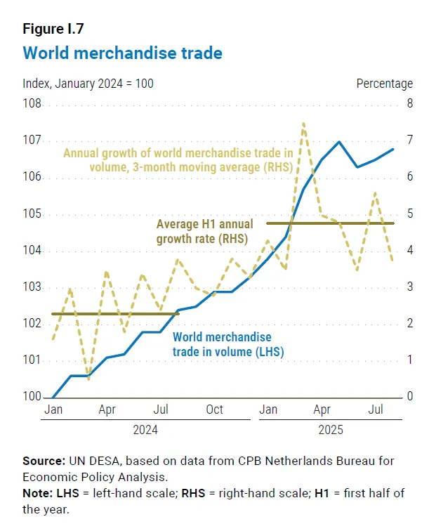 2025年超预期增长:尽管面临高关税和地缘政治不确定性,2025年全球贸易额增长了3.8%,高于预期。主要驱动力是抢出口(为规避预期关税提前发货)和服务贸易(特别是旅游)的稳健复苏。