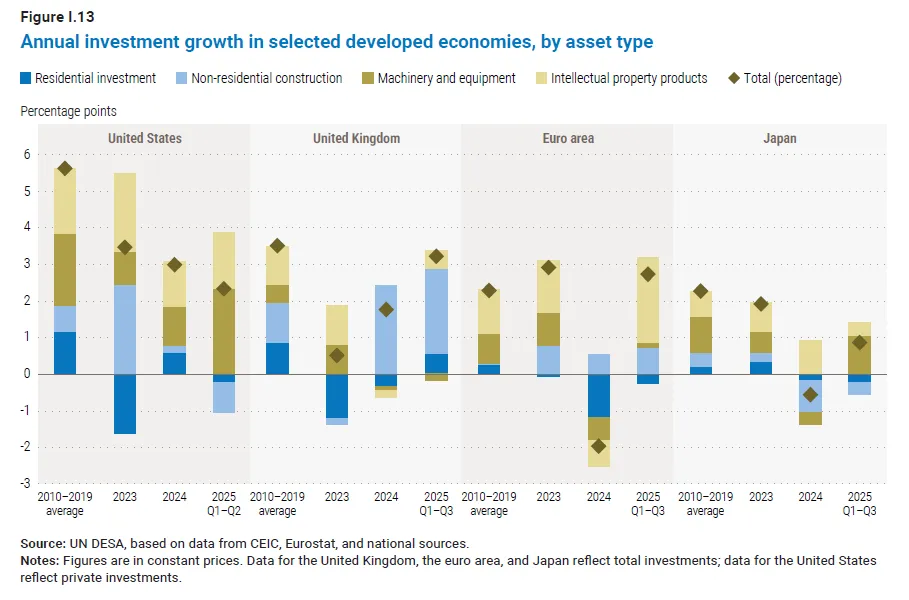 贸易与投资:2025年全球贸易因“抢出口”(企业为规避关税提前发货)而表现强劲,但2026年动能预计放缓。投资普遍疲软,AI相关投资虽是亮点,但范围有限。